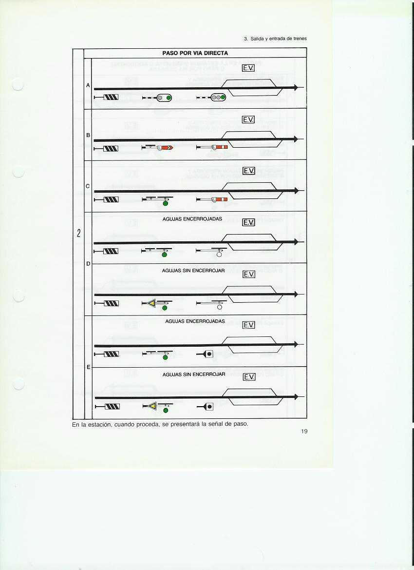 Aquí la presentación es por la forma de recibir al tren, no por la forma de las señales, con lo que es más didáctico, a parte de ser mejores los esquemas, como corresponde al avance de las tecnologías gráficas de 30 años. Pero no baja tanto al detalle de poner la señal de paso o de parada a mano para la parada accidental por el jefe de estación en el eje del edificio de viajeros.