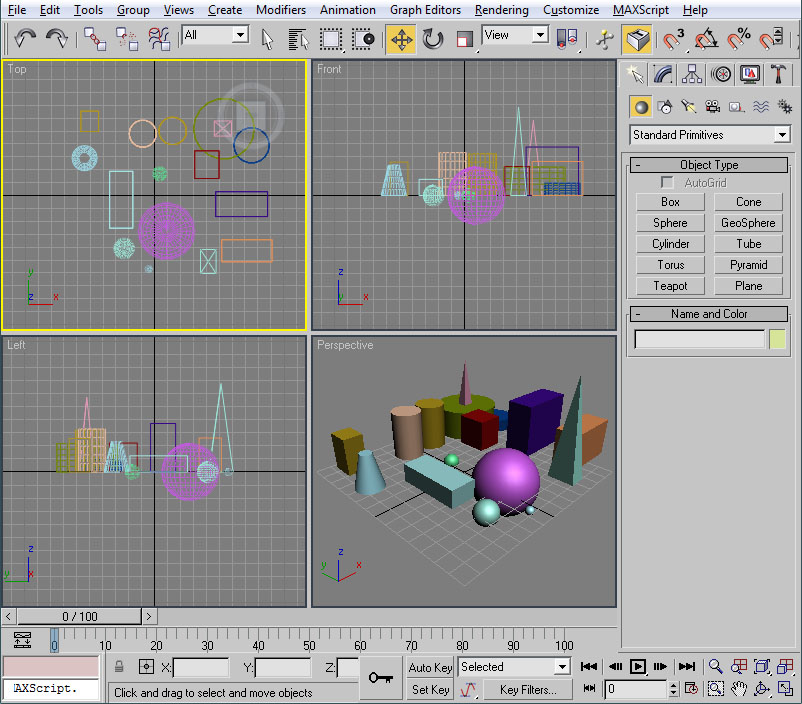 También veo que podré decidir si deseo visualizar el modelo con las superficies cerradas e iluminadas (Smooth + Highlights), o solo el armazón de aristas del modelo (Wireframe). Esto me da una cierta comodidad, pues empiezo a poder decidir en parte la manera en que trabajaré con el 3ds Max.