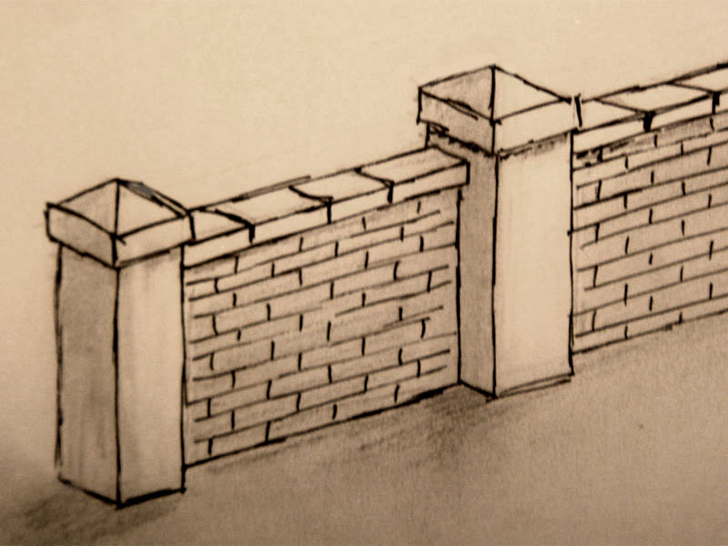 El muro, conceptualizado en el dibujo adjunto (no necesariamente a escala), estará formado por una pared de ladrillo, rematada en su parte superior por unas losas de piedra. Estará enmarcado y sustentado por unas columnas de hormigón, rematadas también en hormigón por una pirámide achatada de base cuadrada.