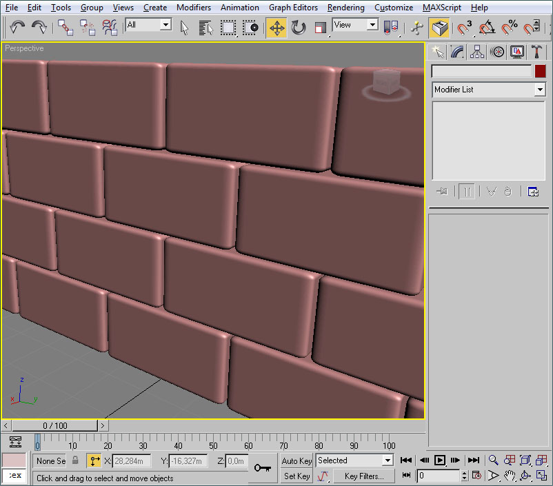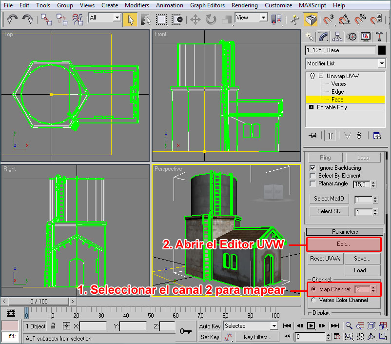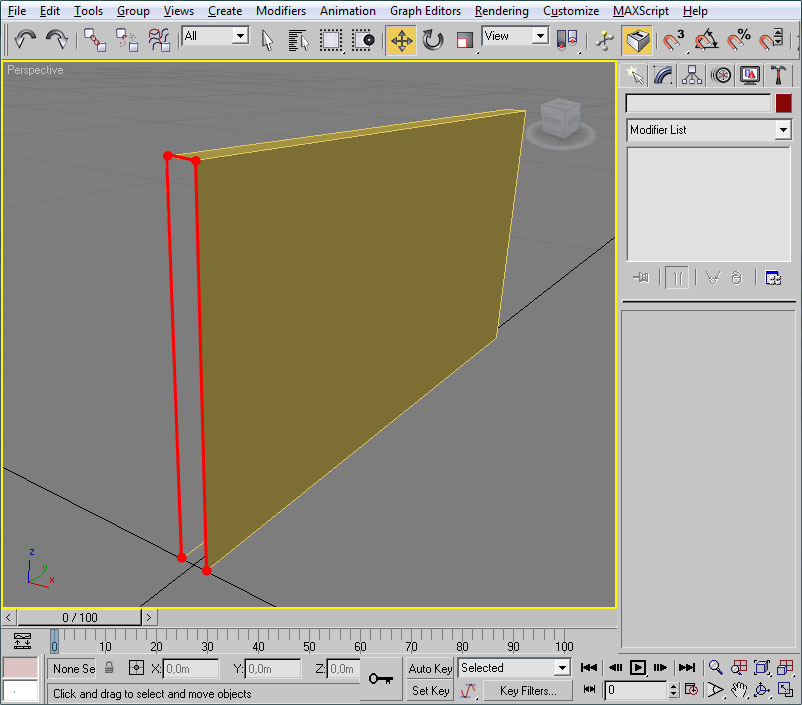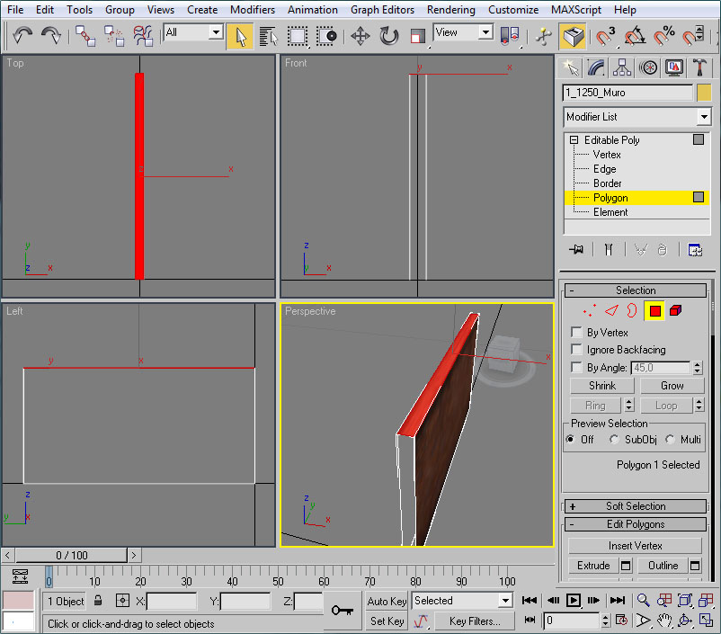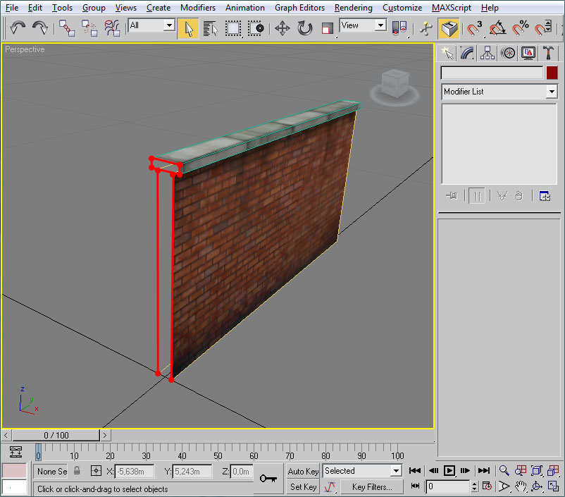 - Una vez abierto el editor UVW pincharemos en un viewport (el de perspectiva será ideal) sobre un lateral del muro.