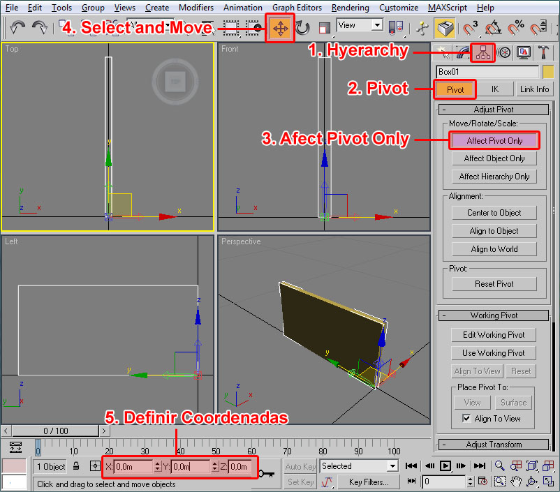 - Introducimos las coordenadas 0, 0 y 0 para situar el pivote en el punto de origen de la escena.