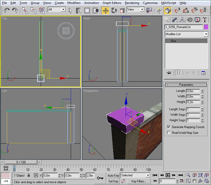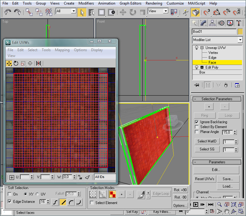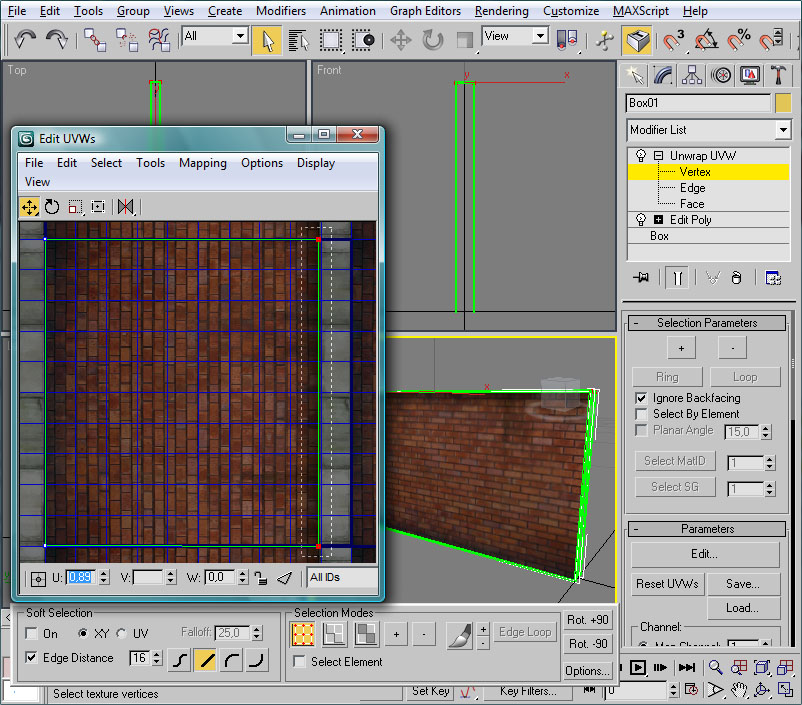 Repetiremos esta acción para el otro lado del muro. Una vez ambos lados tengan el mapeo correcto, nuevamente entraremos en el editor UVW para ajustar el mapeo a la zona de ladrillos exclusivamente: