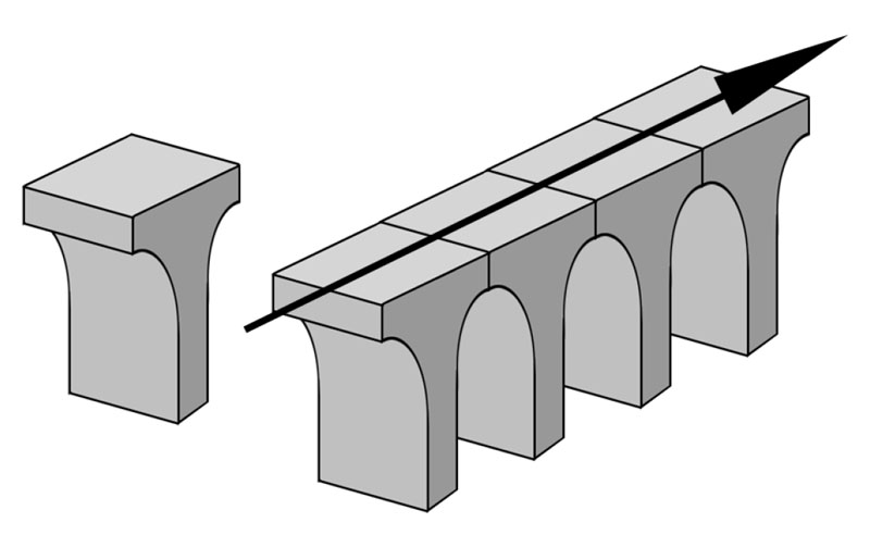Un objeto procedural se puede completar con un elemento fijo para cada uno de sus extremos, y otro objeto fijo que se puede repetir a lo largo del perfil de desarrollo a espacios regulares predeterminados.