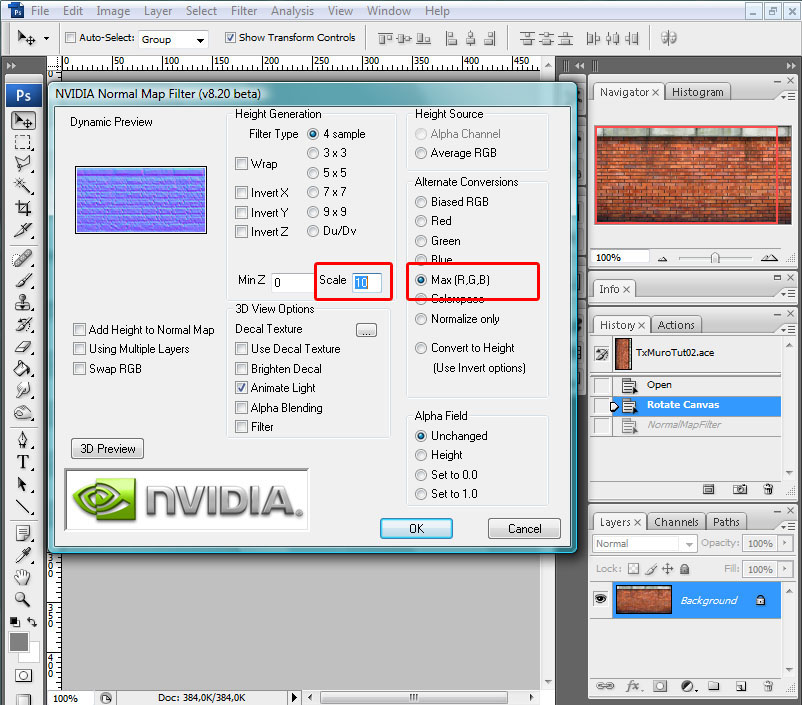Para el primero usaremos la textura de cemento, que no necesita demasiada preparación. Bastará escalar dicha textura a un tamaño de 256x256, pues el original quizás es excesivo, y la guardaremos en formato .ace con un nombre que nos sea significativo. Podemos nombrarla según su contenido (p.e. TxCemento01.ace) o bien según su uso (p.e. TxMuroTut01.ace).