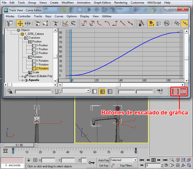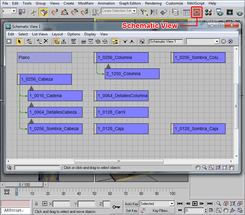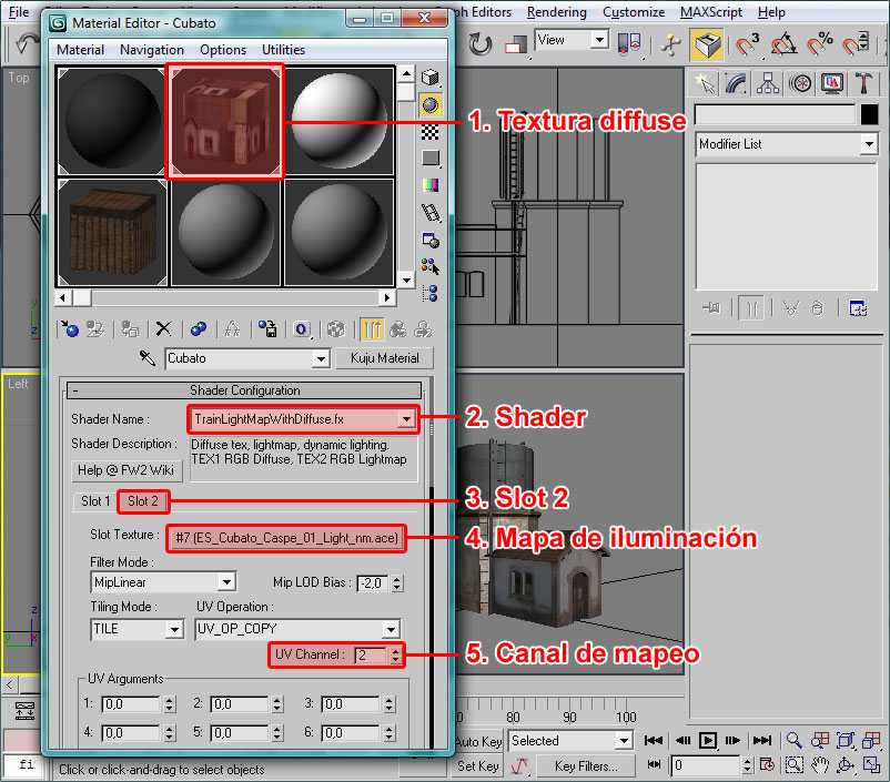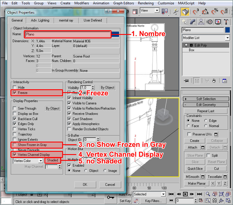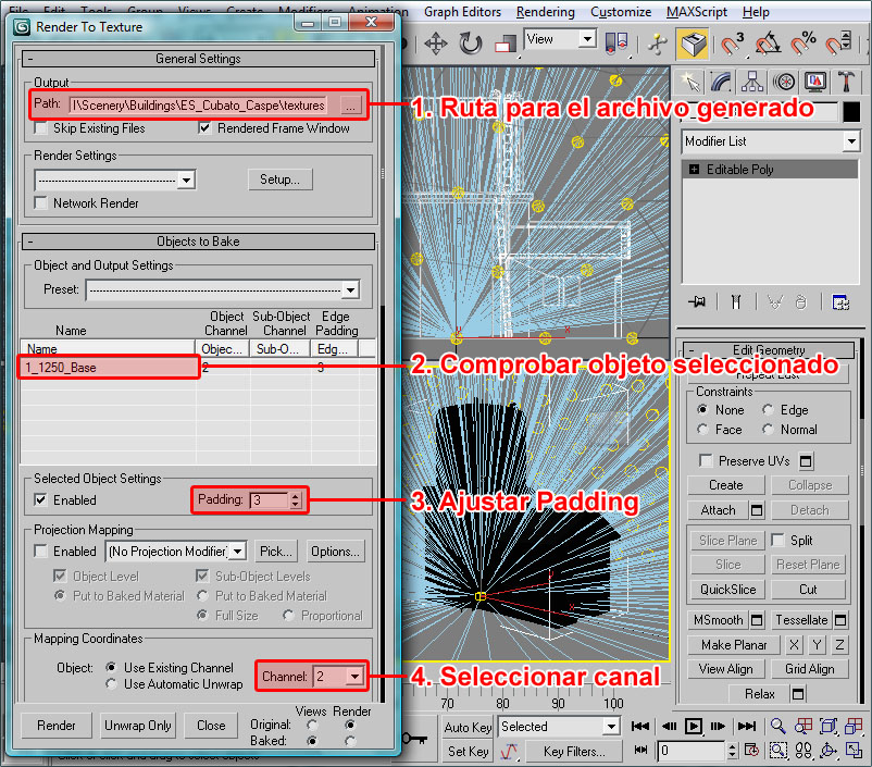 Donde he señalado en rojo el procedural, el cual recuerdo que debe tener todos sus puntos con la coordenada Y=0 (coordenada en 3ds), el pivote centrado en la escena y la extrusión de dicho procedural orientada en la dirección Y del pivot del objeto (con la longitud que deseemos para las texturas).