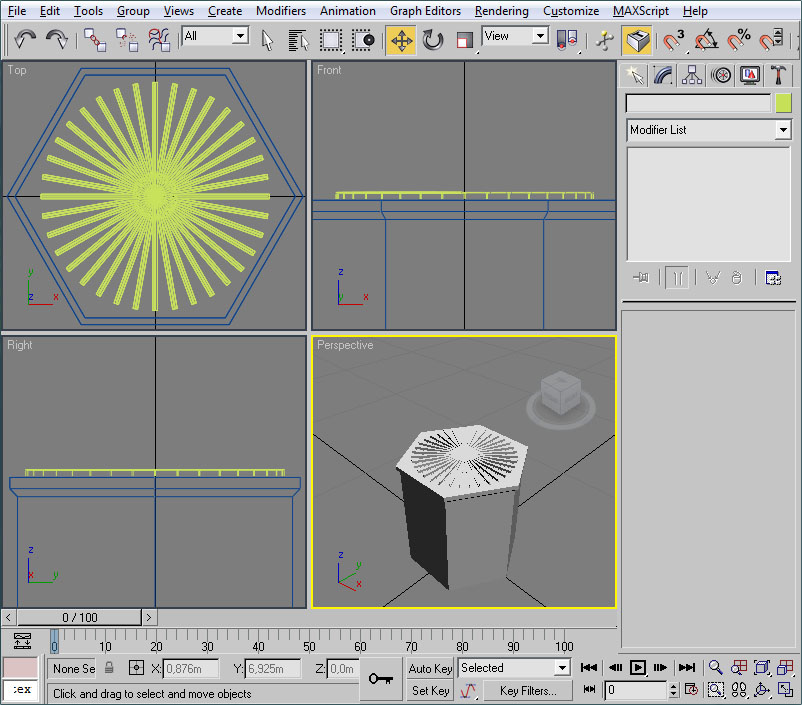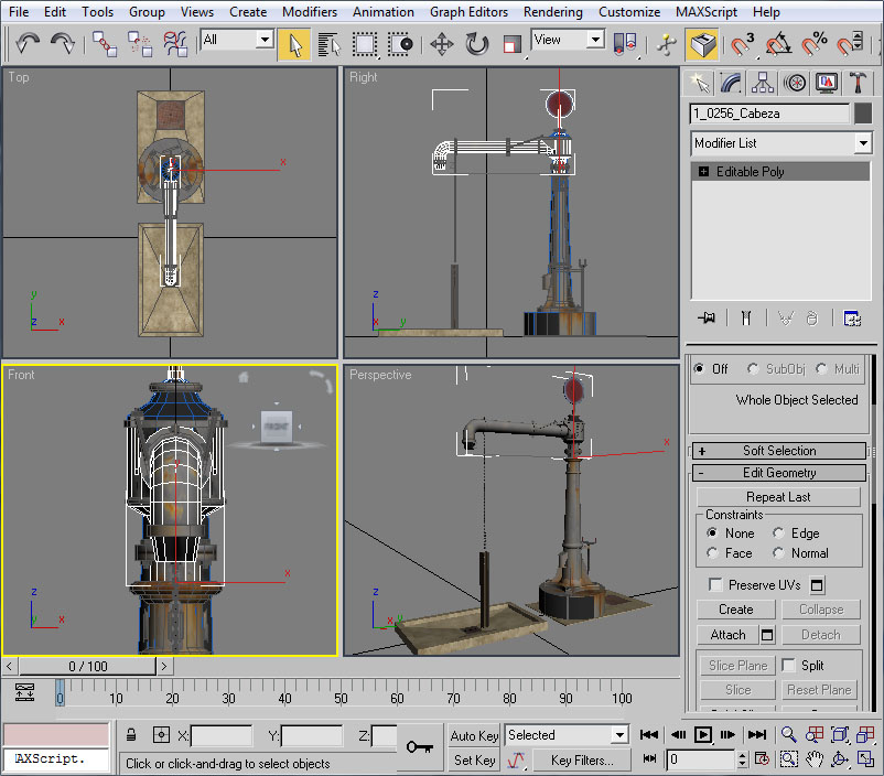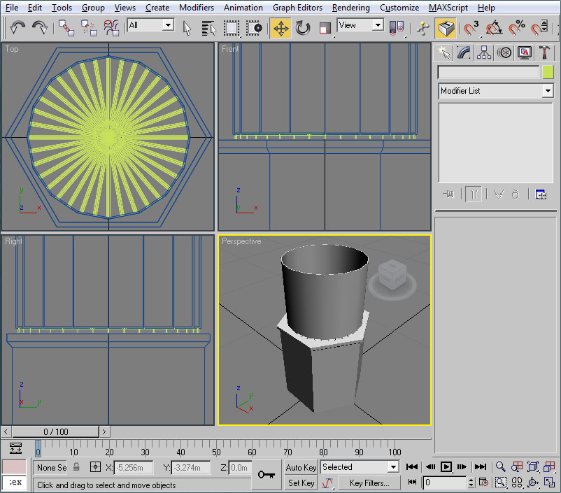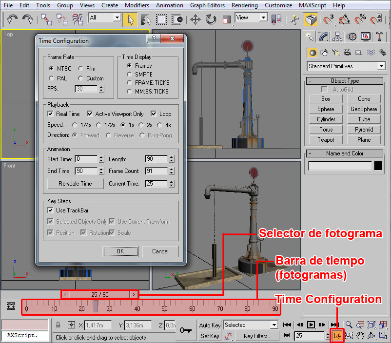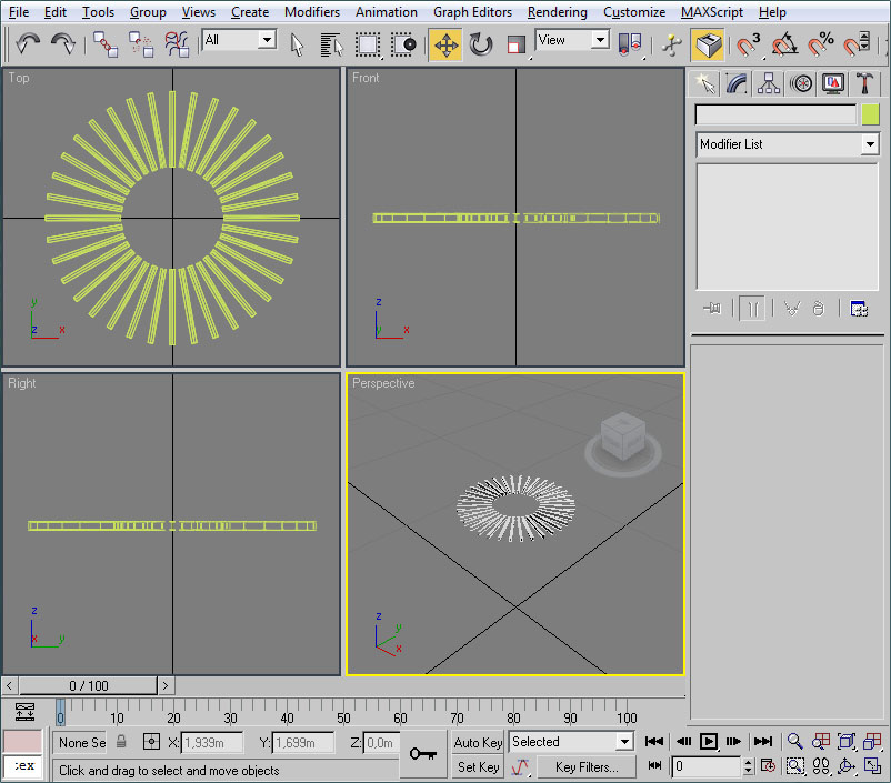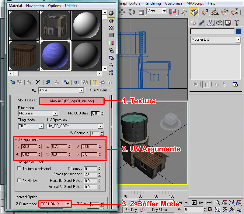 Donde he señalado en rojo el procedural, el cual recuerdo que debe tener todos sus puntos con la coordenada Y=0 (coordenada en 3ds), el pivote centrado en la escena y la extrusión de dicho procedural orientada en la dirección Y del pivot del objeto (con la longitud que deseemos para las texturas).