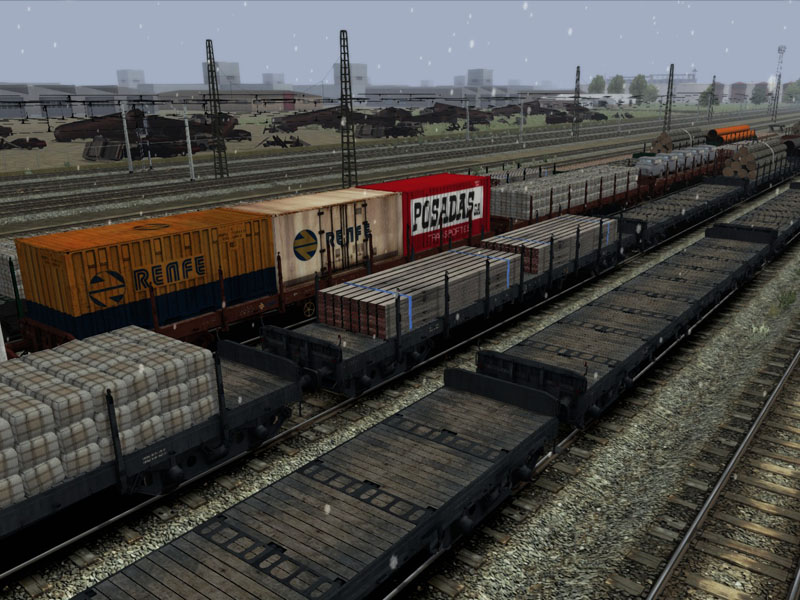 La variedad de cargas es uno de los factores que he potenciado, frente a las 3-4 originales, he creado un montón más, incluyendo contenedores de distintas épocas. He incluido las texturas gris/verde y la opción de vagones con los teleros abatidos para dar más variedad. De hecho, una de las composiciones que más me gusta es la de un tren con un grupo de plataformas con los teleros abatidos.