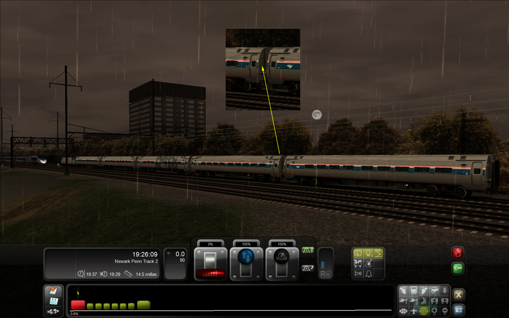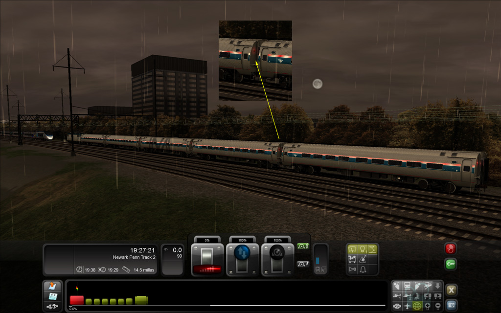 Las luces de los 'amfleets'... ¡Claro, por eso con el 'Acela' sin más tráfico no daba problemas! La cuestión debe ser que el simulador calcula todas las luces del material en vía en un escenario dado. Si fuera solo por las locomotoras tal vez no habría problemas, ¡pero es que en este escenario hay cientos y cientos de luces que calcular!