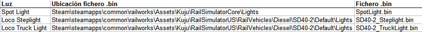 Debemos tener presente que el nombre de las luces es un convencionalismo para organizar y trabajar con las mismas. Partamos de la base que el motor renderizará lo que determine el fichero .bin de la luz. La única diferencia es su ubicación: en una ruta las colocamos manualmente en el lugar deseado, y en las locomotoras debemos indicarlo en un fichero (ver sobre este tema el trabajo de Jesús en viewtopic.php?f=34&t=27344 ).