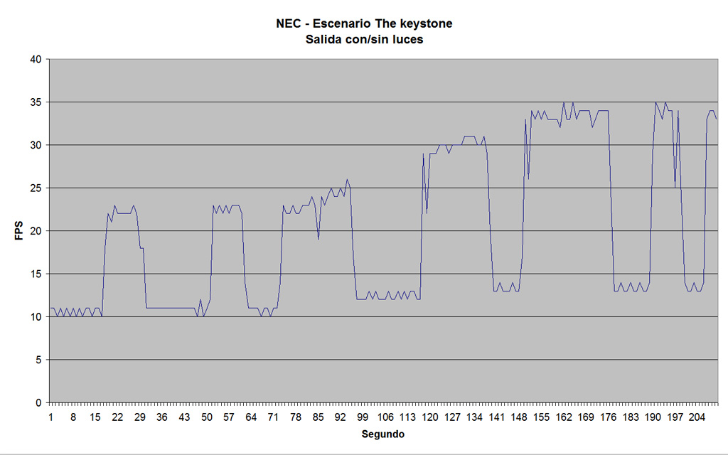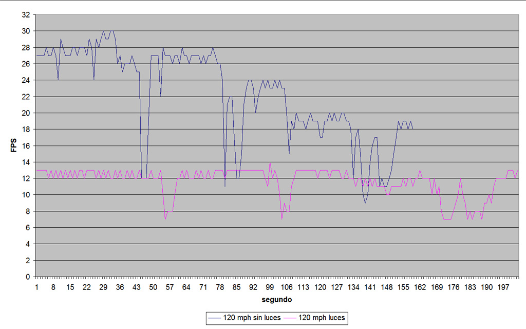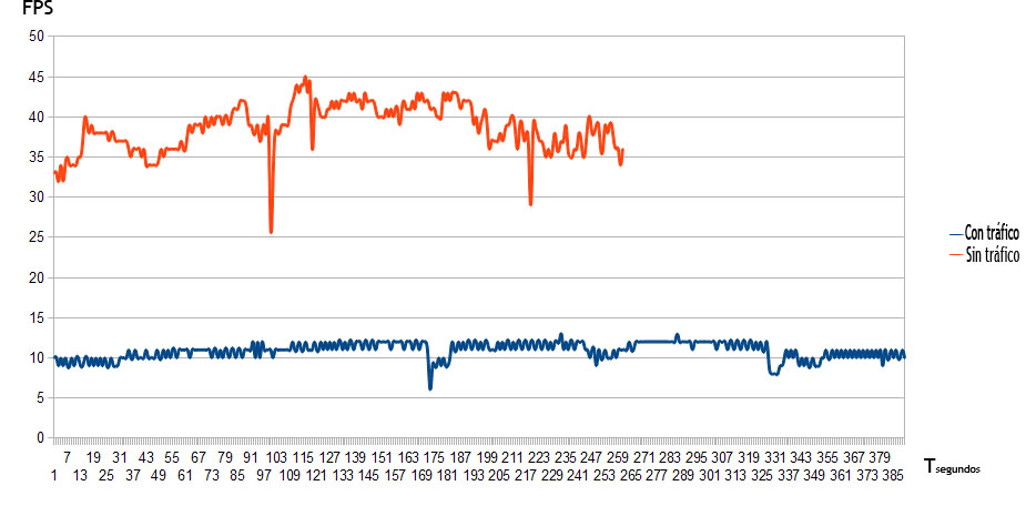 No hay sombras ni luces ni antialising. En el escenario original la media es de 15fps, mientras que sin tráfico sube hasta 85fps.