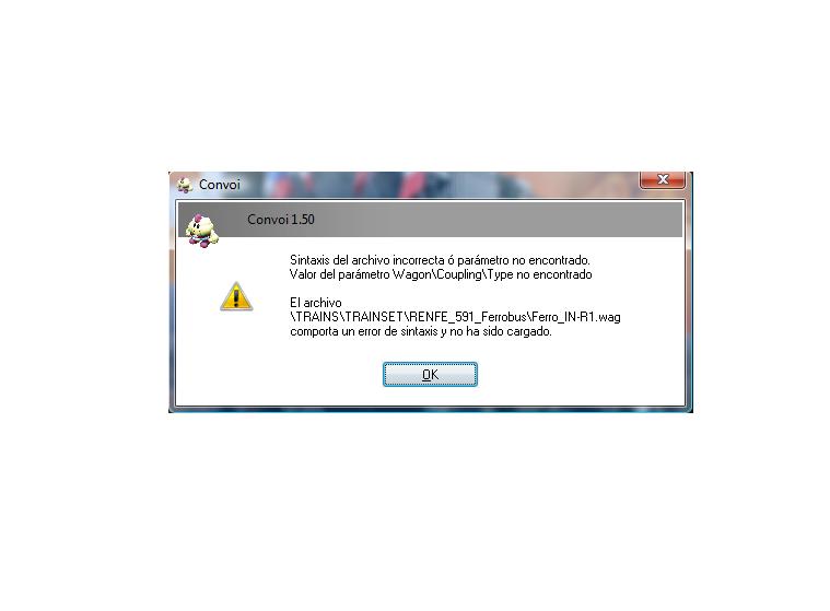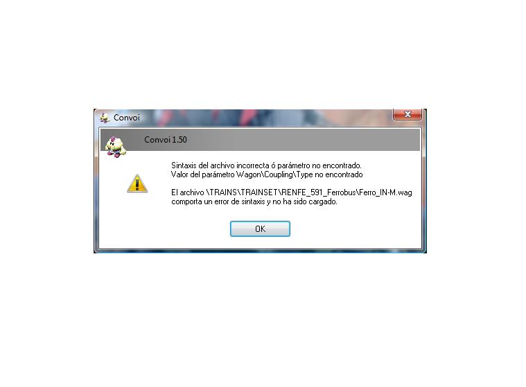 El segundo tren o sea regional 591 ferrobus v.2, el archivo wag que falla, es el de uno de los vagones. No puedo concretarte cual, pues estoy en centro publico y hasta que no vaya a mi casa no lo podria ver. El ferrobus consta de 5 o 6 archivos con y dentro de carpeta TRAINSET hay varios archivos wag de diferentes vagones del mismo. El wag que falla, esta en TRAINSET, pero juego no lo detecta. Al inicial el train simulator me sale el mensaje de error, nombre del archivo.wag no se encuentra o parecido.