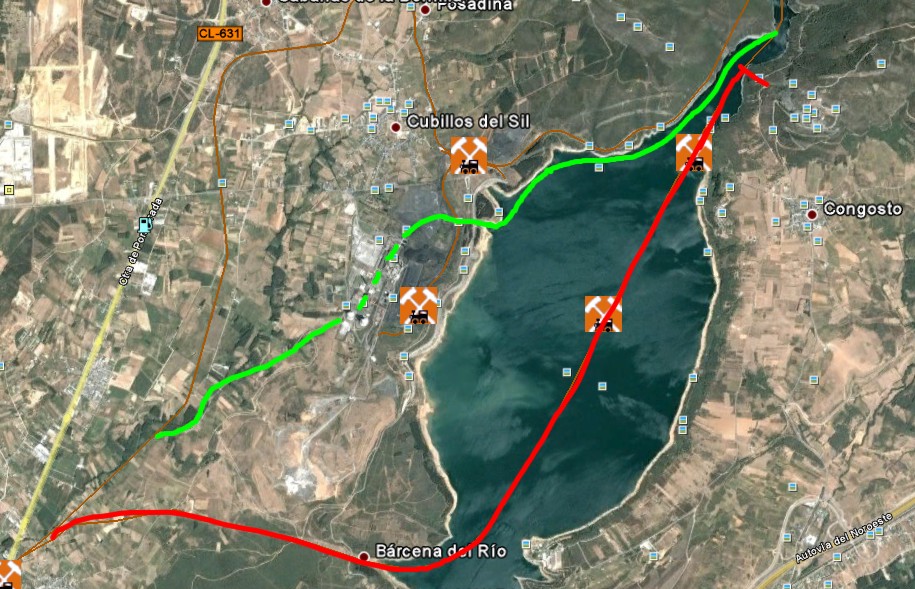 3.- Cubillos: La línea roja es falsa. El recorrido original hasta la construcción del embalse sigue la verde, que no se puede determinar en la zona de la térmica por haber desaparecido todo rastro.