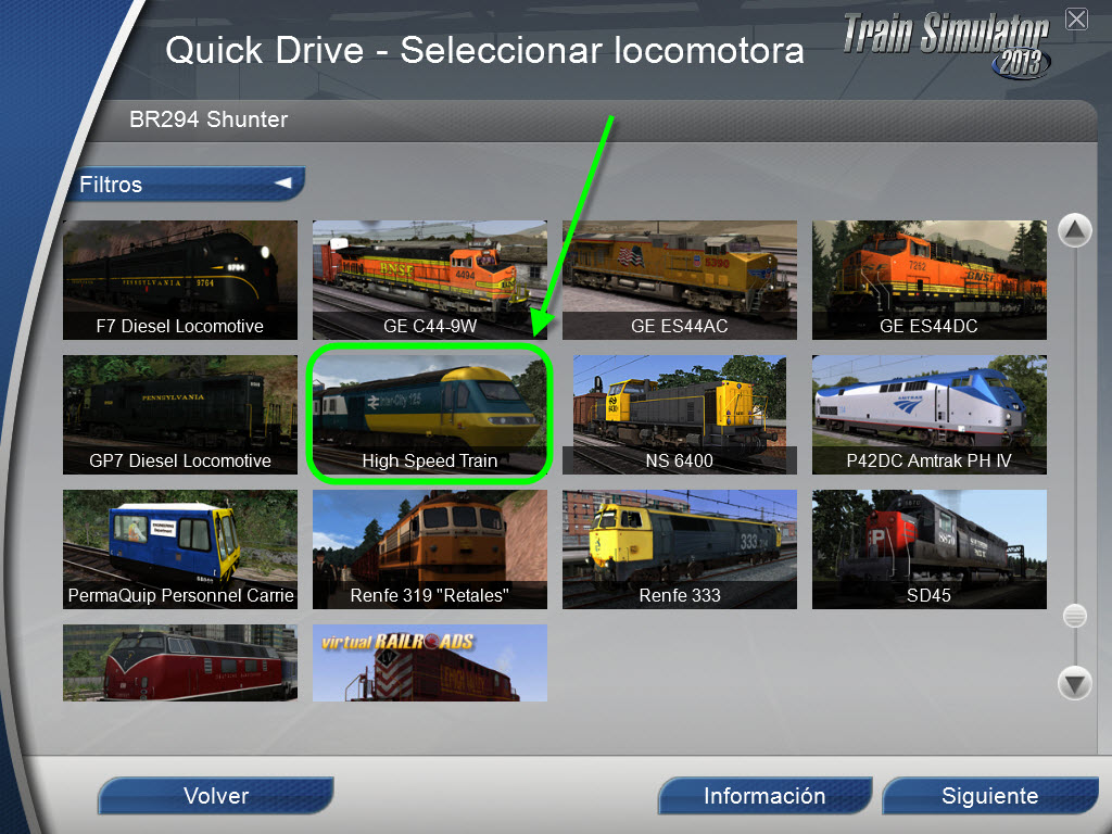 Para el Quick Drive, en el menú "Seleccionar locomotora" hay que seleccionar el "High Speed Train":